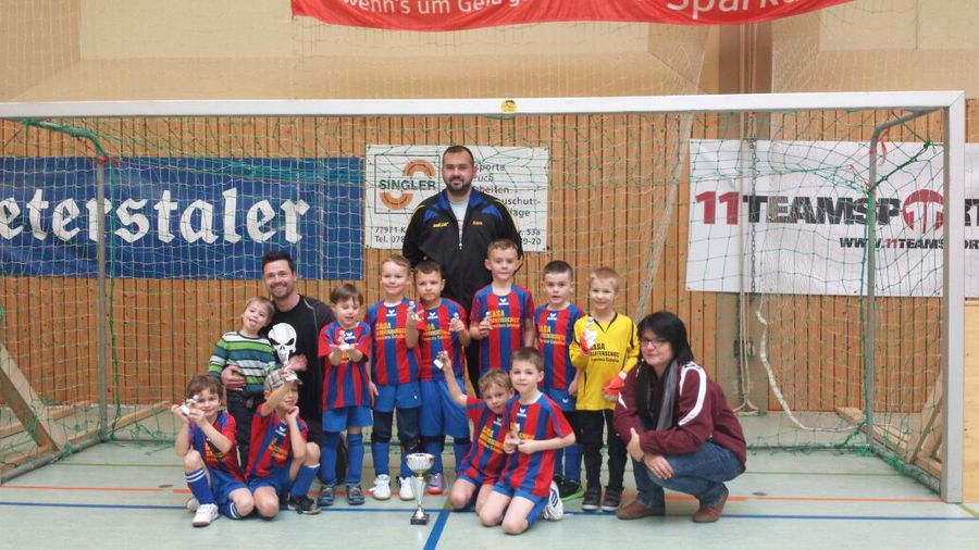 Erneut erfolgreich waren unsere Jüngsten beim diesjährigen Hallenturnier in Schmieheim. Im ersten Spiel setzten sie sich gegen den Gastgeber mit 3:0 durch. Auch der SV Wagenstadt wurde geschlagen, hier musste unsere Mannschaft allerdings das einzige Gegentor hinnehmen, Ergebnis 3:1. In der dritten Begegnung war der Gegner der FV Ettenheim, hier lautete da endresultat 2:0. So ging es in der letzten Partie gegen Grafenhausen um den Turniersieg. Auch hier konnten wir uns in einem packenden Spiel mit 2:0 durchsetzen. Als Belohnung gab es für die Mannschaft einen großen Pokal und für jeden Spieler noch eine Sportlerfigur.