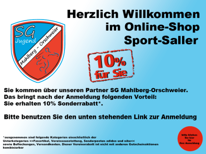 Nach jahrelanger, guter Zusammenarbeit mit dem Sportausrüster Sport-Saller wollen wir nun den Bestellvorgang für beide Seiten optimieren. Oft erhalten wir von neuen Spielern oder Eltern eine Anfrage bezüglich Trainingsanzügen. Bisher fand pro Jahr nur eine Bestellung statt. Ab sofort hat die SG-Mahlberg-Orschweier unter dem folgenden Link einen eigenen Fanshop:
